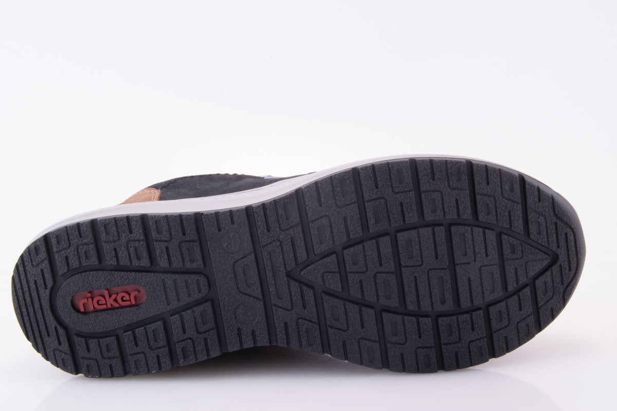 - Material Față: piele naturală nabuk, piele ecologica, de inalta calitate, tipul varfului: rotund, tip inchidere: siret si fermoar pe exterior, cu tehnologia RIEKER TEX (piele tratata special pentru protectie la apa, protectie impotriva frigului, lasa piciorul sa respire)